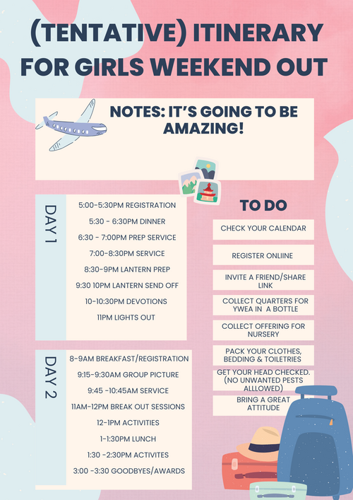 Join us for Girl’s Day Out, a special time of faith, fun, and fellowship! This year’s event will inspire and equip you to grow in your relationship with God and share His love with others. Get ready for a weekend filled with fun activities, breakout sessions, and services. With plenty of fun things to do, meaningful connections to make, and an overnight stay at the campground, this will be an unforgettable experience. Come ready to be encouraged, refreshed, and empowered to shine for Christ!